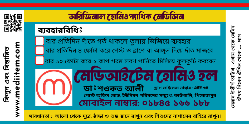 মেডিআইটেম হোমিও হল – চিকিৎসার জন্য যোগাযোগ 01845 166 188 ( ঠিকানা: পোস্ট অফিস রোড, ইউনিয়ন পরিষদের সম্মুখে, কাউখালি, পিরোজপুর )