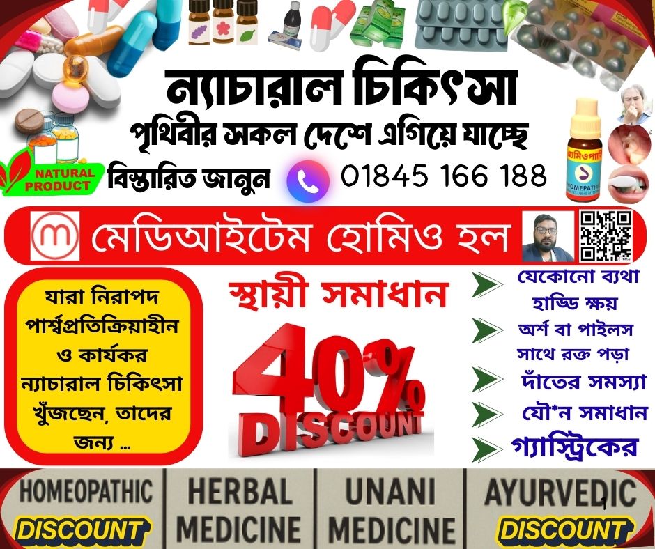 আজকের যুগে বিশ্বজুড়ে মানুষ যখন পার্শ্বপ্রতিক্রিয়াহীন, নিরাপদ এবং দীর্ঘস্থায়ী সমাধান খুঁজছে—ঠিক সেই সময়ে “মেডিআইটেম হোমিও হল” নিজেকে এক অসাধারণ চিকিৎসা কেন্দ্র ও বিশ্বস্ত দোকান হিসেবে প্রতিষ্ঠিত করেছে। হোমিওপ্যাথিক, হারবাল, ইউনানী, আয়ুর্বেদিক—এই চারটি শাখার সমন্বয়ে গড়ে ওঠা এই দোকানটি শুধু পণ্য বিক্রির কেন্দ্র নয়, বরং মানসম্মত স্বাস্থ্যসেবা এবং প্রাকৃতিক চিকিৎসার সচেতনতা বৃদ্ধির একটি নির্ভরযোগ্য প্ল্যাটফর্ম।